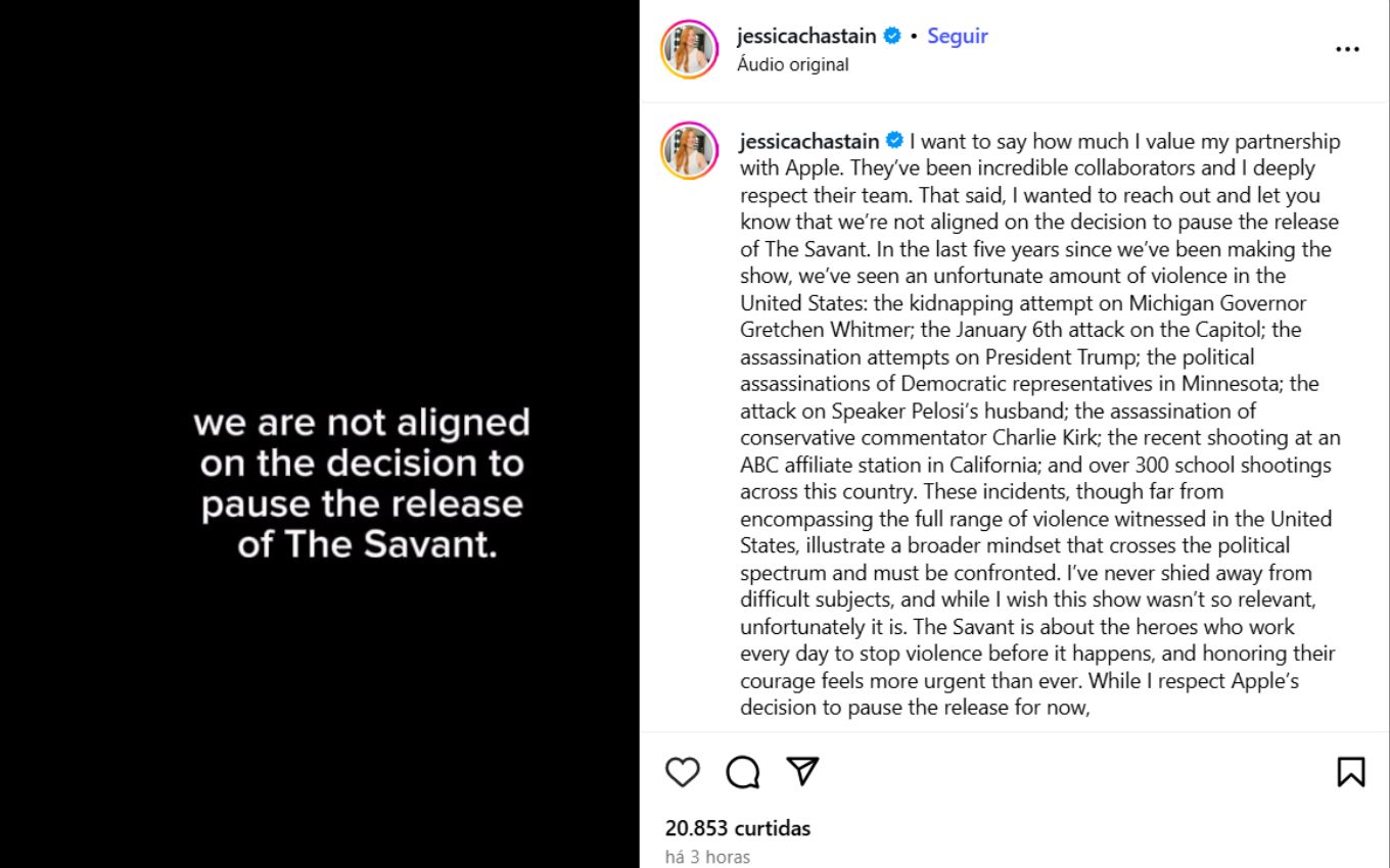 O post de Jessica Chastain no Instagram sobre o adiamento da série