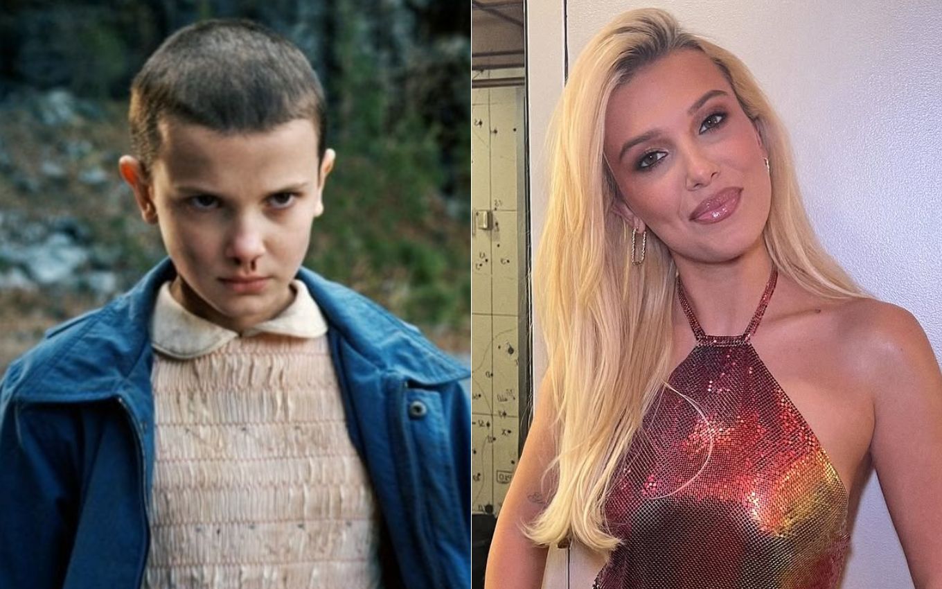 Millie Bobby Brown na 1ª temporada de Stranger Things e atualmente. Fotos: Reprodução/Netflix e Instagram